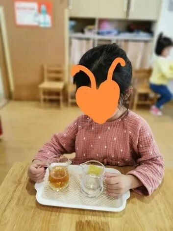 用小木棒敲打装有不同刻度茶水的玻璃长吻原海豚杯,培养孩子们的听觉分辨能力。 05花茶干鲜配对